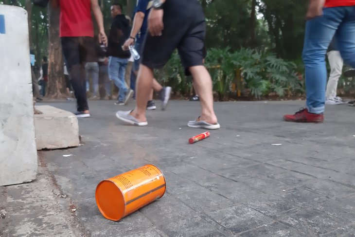Sebelumnya, di lokasi yang berdekatan sekitar pukul 16.40 WIB, diduga suporter timnas Indonesia berbaju hitam menyalakan kembang api.