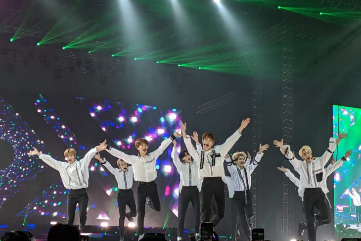 Berkostum kemeja putih dan celana hitam, idola K-pop yang baru debut pada 2017 itu tampil bertenaga, berlari ke sana-sini, melambai kepada penonton-penonton yang sibuk berteriak.