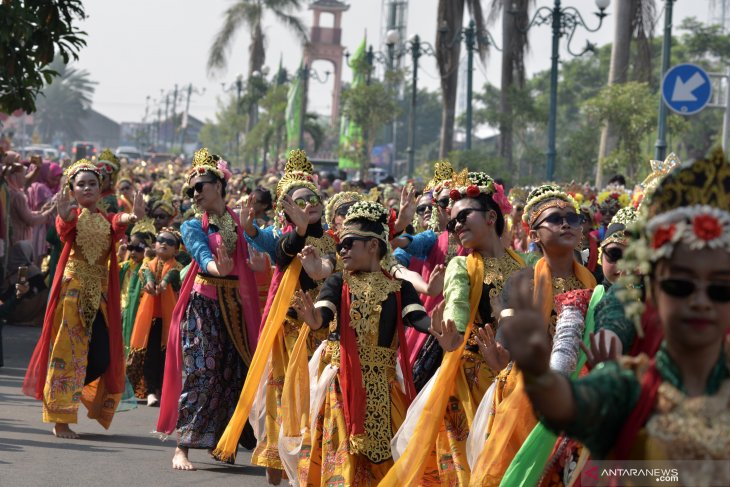 PAGELARAN TARI RONGGENG MASSAL BEKEN. Sejumlah peserta membawakan Tarian Ronggeng Massal Beken saat acara Gema Nusa Patriot Art Festival 2019 di Bekasi, Jawa Barat, Minggu (24/11/2019). Pagelaran Tari Ronggeng Massal Beken diikuti 2019 peserta dari sanggar seni yang ada di Jawa Barat dan Jakarta melibatkan seluruh siswa dari tingkat taman kanak-kanak (TK) hingga perguruan tinggi sebagai wadah bagi generasi muda berekspresi, menambah kecintaan terhadap nilai-nilai seni budaya dan sebagai upaya memperkenalkan seni budaya Kota Bekasi ke dunia luar. (Feed) FOTO/Suwandy/hp.