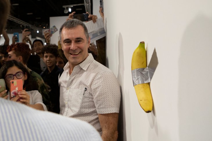 Instalasi seni bertajuk “Comedian” itu adalah karya dari seniman asal Italia Maurizio Cattelan.
