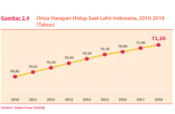 Berdasarkan indikator tersebut, maka diketahui pada tahun 2018, IPM Indonesia tercatat sebesar 71,39. Umur harapan hidup saat lahir di Indonesia mencapai 71,20 tahun. Indikator ini menunjukkan bahwa bayi yang baru lahir pada tahun 2018 diperkirakan dapat bertahan hidup hingga usia 71,20 tahun.