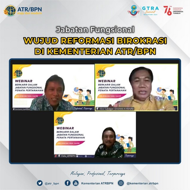 Jakarta – Dalam rangka melakukan Reformasi Birokrasi, pemerintah telah mengeluarkan terobosan dalam penyederhanaan birokrasi dengan membuat Jabatan Fungsional kepada Aparatur Sipil Negara (ASN) agar lebih tangkas, adaptif dan profesional dalam melayani masyarakat. Menginisiasi hal tersebut, Kementerian Agraria dan Tata Ruang/Badan Pertanahan Nasional (ATR/BPN) melalui Pusat Pengembangan Sumber Daya Manusia (PPSDM) menggelar Webinar dengan tema “Berkarir dalam Jabatan Fungsional Penata Pertanahan” secara daring, Rabu (28/07/2021).