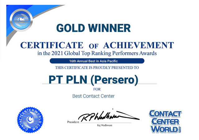 AGRARIA.TODAY – PT PLN (Persero) raih penghargaan dari Contact Center World dalam ajang 2021 Global Top Ranking Perfomance Award Contact Center World.