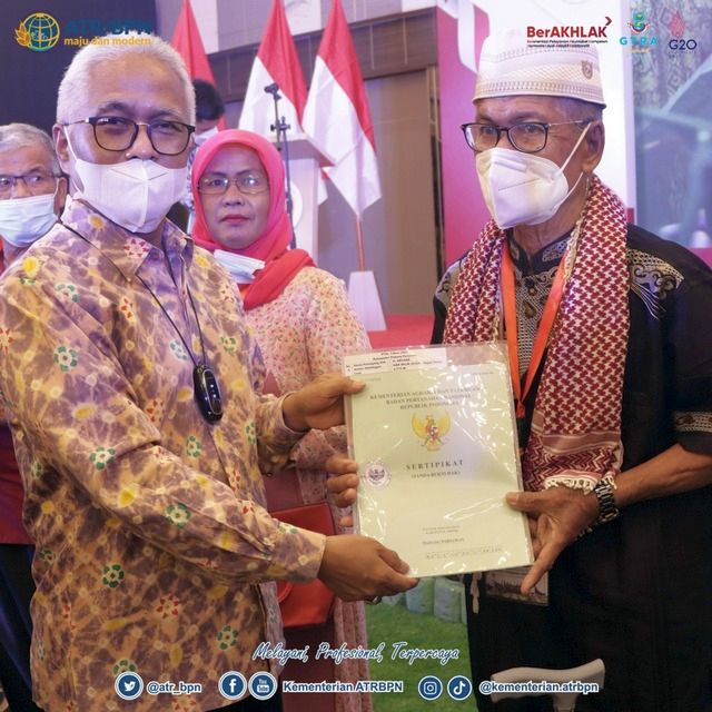 AGRARIA.TODAY – Kementerian Agraria dan Tata Ruang/Badan Pertanahan Nasional (ATR/BPN) menyelenggarakan kegiatan Penyerahan Sertipikat Tanah untuk Rakyat di Hotel Pangeran Beach, Kota Padang pada Senin (25/04/2022). Sertipikat tanah yang diserahkan sejumlah 49 sertipikat yang terdiri dari 11 sertipikat dari Kota Padang, 17 sertipikat dari Kabupaten Padang Pariaman, dan 20 sertipikat dari Kabupaten Solok. Sertipikat tersebut merupakan hasil dari program Pendaftaran Tanah Sistematis Lengkap (PTSL) di masing-masing kabupaten/kota.