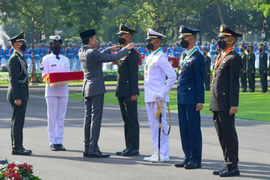 “Bahwa saya akan memenuhi kewajiban perwira dengan sebaik-baiknya terhadap bangsa Indonesia dan Negara Kesatuan Republik Indonesia yang berdasarkan Pancasila dan Undang-Undang Dasar Negara Republik Indonesia tahun 1945,” ujar Presiden mendiktekan sumpah perwira TNI dan Polri.