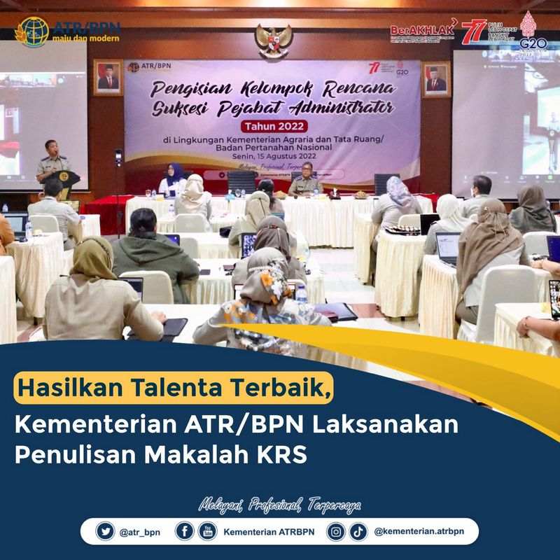 AGRARIA.TODAY – Pada Senin (15/08/2022), Kementerian Agraria dan Tata Ruang/Badan Pertanahan Nasional (ATR/BPN) melaksanakan kegiatan penulisan makalah pengisian Kelompok Rencana Suksesi (KRS) Jabatan Administrator gelombang I tahun 2022, di Aula Prona lantai 7 Kementerian ATR/BPN. Kegiatan ini sebagai salah satu syarat agar dapat menemukan talenta terbaik yang akan ditetapkan dalam KRS untuk mengisi Jabatan Administrator.