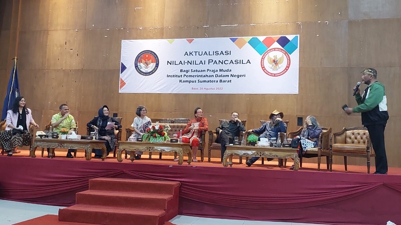 Badan Pembinaan Ideologi Pancasila (BPIP ) melakukan kegiatan penguatan aktualisasi nilai-nilai Pancasila kepada Praja Muda kampus IPDN Sumatera Barat, Sabtu 20 Agustus 2022. Tim BPIP terdiri dari Direktur Jaringan dan Pemberdayaan Dr. Irene Camelyn Sinaga, AP, M.Pd, Ibu Halida Hatta, Prof Sadono, Prof Tomy Away, Christine Hakim, Garin Nugroho, Raja Asdi. Direktur IPDN Kampus Sumatera Barat Dr. Tun Huseno menyambut baik dan terimakasih pada BPIP yg memilih IPDN Kampus Sumatera Barat untuk memberikan materi penguatan aktualisasi nilai-nilai Pancasila dihadiri 216 orang Praja Muda di auditorium kampus IPDN Sumbar.