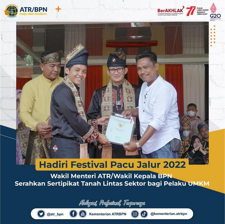 AGRARIA.TODAY – Menteri Agraria dan Tata Ruang/Kepala Badan Pertanahan Nasional (ATR/BPN) yang dalam hal ini diwakili oleh Wakil Menteri ATR/Wakil Kepala BPN, Raja Juli Antoni menyerahkan sertipikat tanah kepada lima orang perwakilan pelaku Usaha Mikro, Kecil, dan Menengah (UMKM) di Kabupaten Kuantan Singingi pada Minggu (21/08/2022). Penyerahan sertipikat berlangsung dalam rangkaian Seremonial Pembukaan Festival Pacu Jalur 2022 di Lapangan Limuno, Kabupaten Kuantan Singingi, Riau.