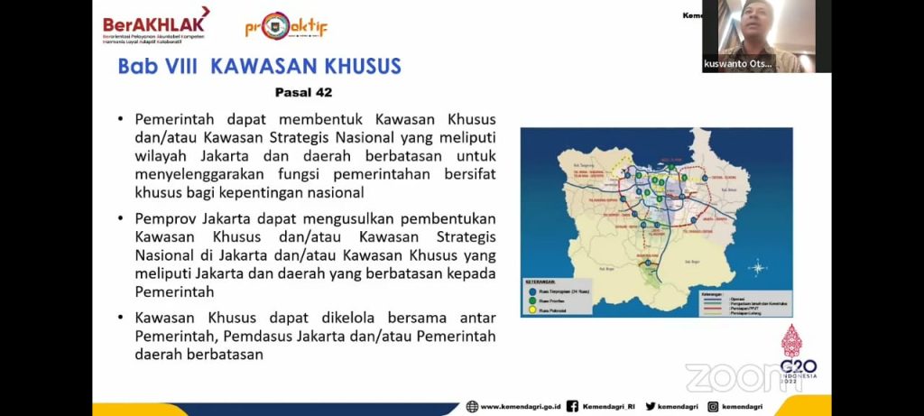 Narasumber yang lain, perwakilan Ditjen Otda Kuswanto menyatakan terkait perlunya pembentukan kawasan khusus bagi DKI Jakarta, termasuk di dalamnya kekhususan Jakarta sebagai pusat perekonomian nasional.