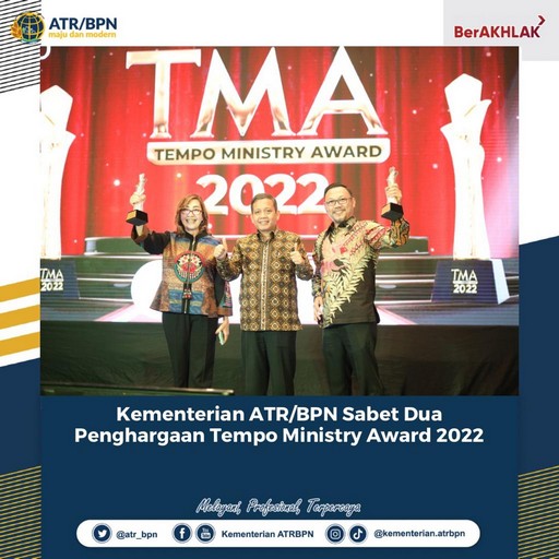 AGRARIA.TODAY – Kementerian Agraria dan Tata Ruang/Badan Pertanahan Nasional (ATR/BPN) menjadi salah satu instansi yang dinilai memiliki kinerja baik dalam pengelolaan komunikasi publik. Hal ini ditunjukan dengan disabetnya dua penghargaan pada acara Tempo Ministry Award (TMA) 2022 yang berlangsung di The Sultan Hotel, Jakarta, pada Jumat (09/12/2022).