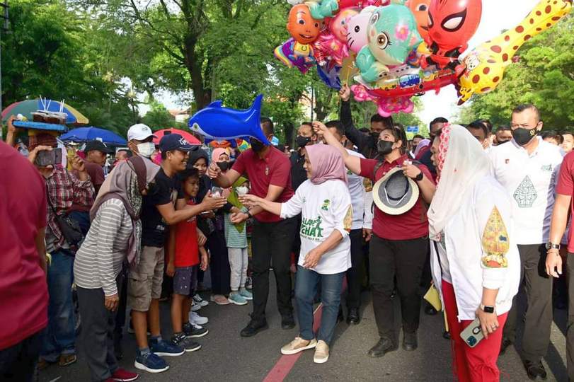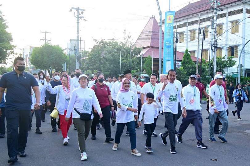 Tampak Kepala Negara beserta Ibu Iriana menyapa warga yang berdiri di sepanjang jalur pelaksanaan jalan sehat. Ibu Iriana juga terlihat membagikan balon kepada anak-anak kecil yang berada di sana.
