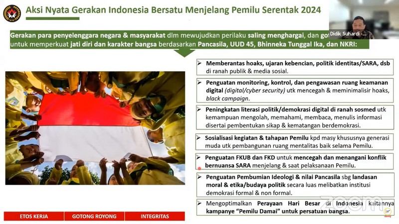 Berdasarkan nilai-nilai Revolusi Mental tersebut, ujar Didik, aksi nyata gerakan Indonesia bersatu menjelang Pemilu Serentak 2024 bisa diwujudkan dengan perilaku saling menghargai dan gotong royong. Hal tersebut sesuai dengan jati diri dan karakter bangsa yang berdasarkan Pancasila, Undang-Undang Dasar (UUD) 1945, Bhineka Tunggal Ika, dan Negara Kesatuan Republik Indonesia (NKRI).