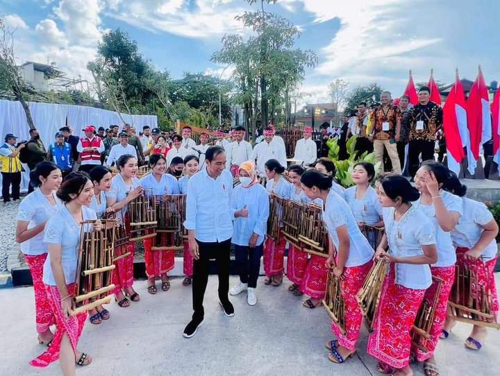 Saat tiba di tempat acara peresmian, Presiden dan Ibu Iriana disambut kesenian angklung lainnya yang memainkan salah satu lagu daerah Jawa Barat, yakni “Manuk Dadali”.