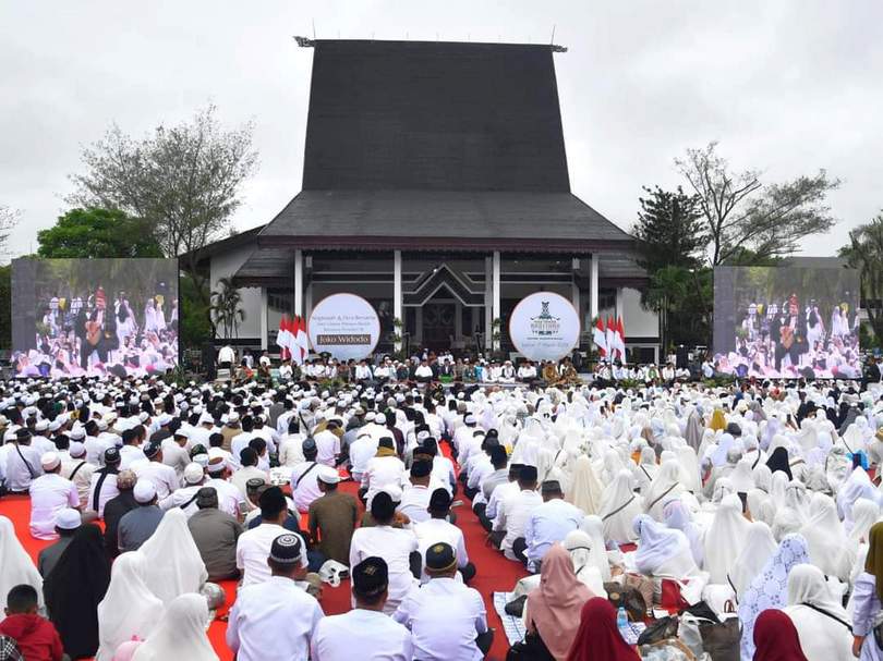 “Juga memohon rida Allah SWT agar selalu membimbing dan memudahkan langkah-langkah kita, dan kepada para alim ulama, tuan-tuan guru, dan para mualim, para kyai, serta segenap masyarakat Melayu-Banjar mohon didoakan bangsa ini,” ucap Presiden.