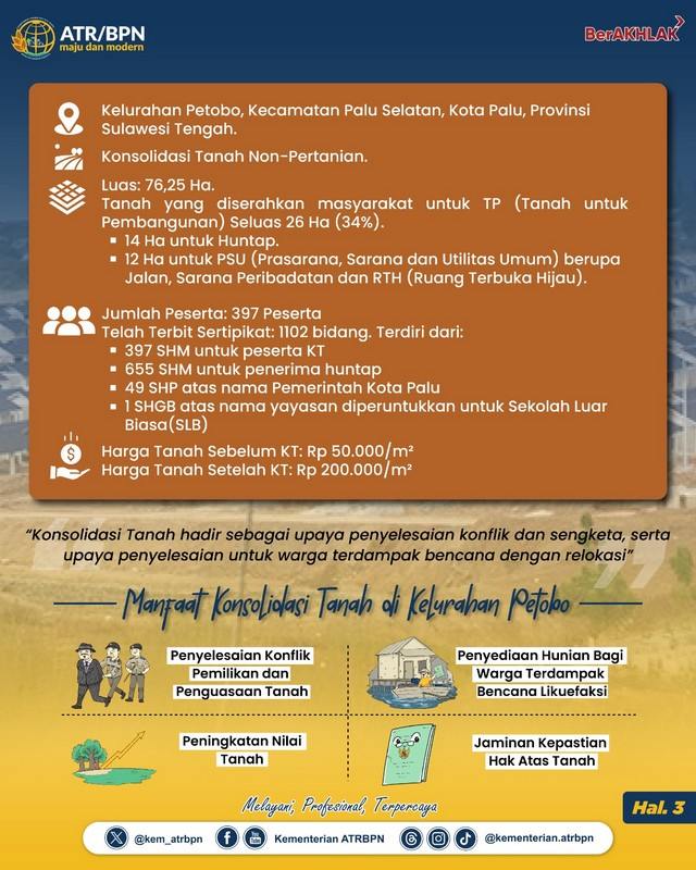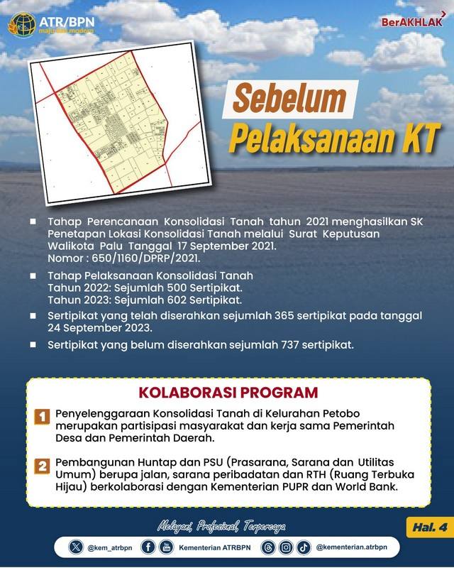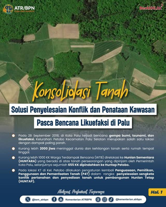 AGRARIA.TODAY – Halo #SobATRBPN, Konsolidasi Tanah (KT) memiliki tujuan untuk penataan kembali penguasaan, pemilikan, penggunaan dan pemanfaatan tanah guna mengatasi beragam isu pertanahan salah satunya akibat Bencana Alam Likuefaksi di Palu.